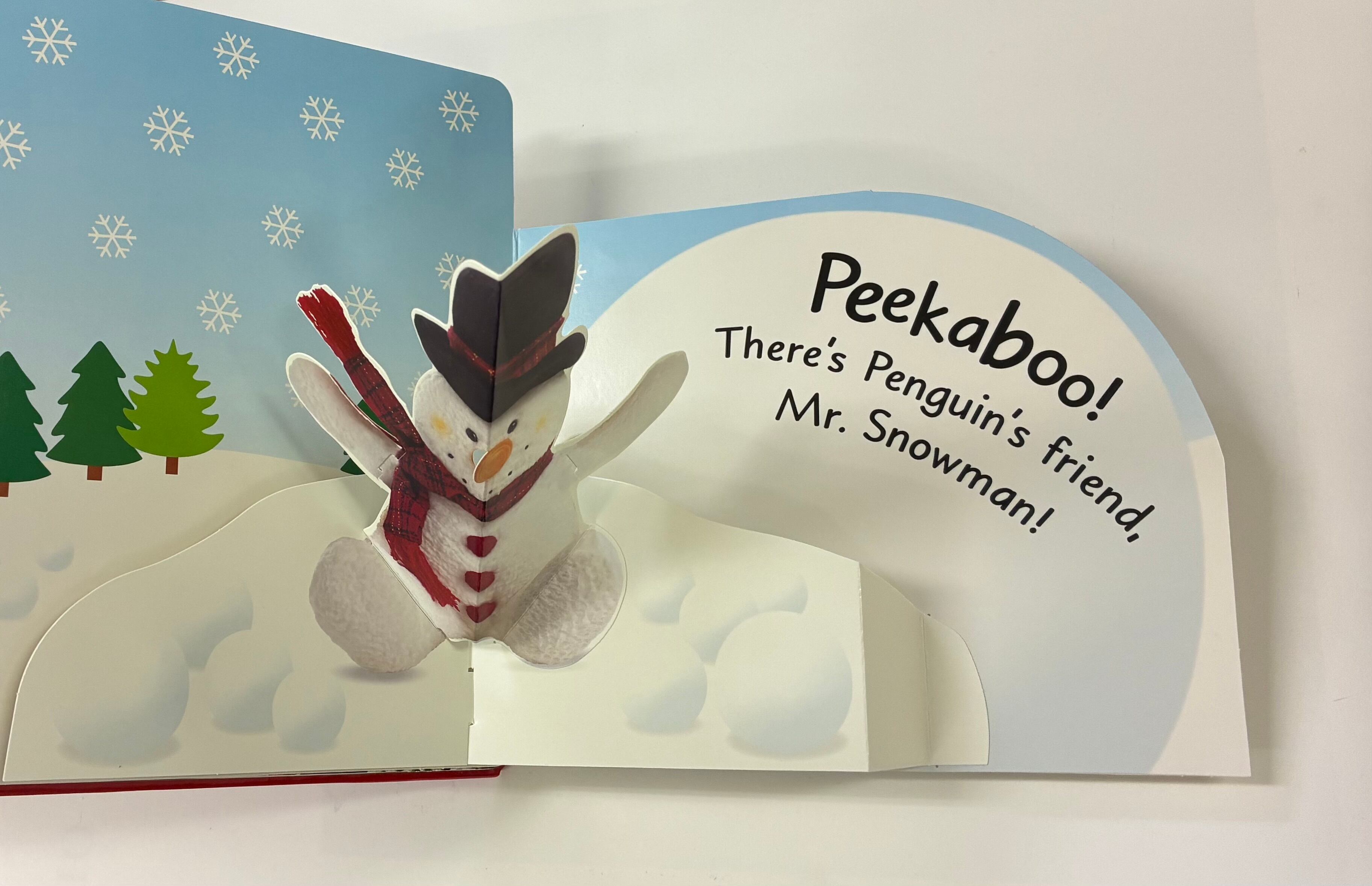 クリスマスをテーマにした楽しいピーカーブー(いないいないばあっ!)ブックです。サンタの袋、雪だるま、靴下などの仕掛けをめくるとポップアップで楽しいサプライズが待っています。