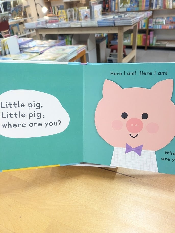 子豚、ひよこ、仔牛、子羊が子供たちにご挨拶。動物たちの顔の扉を捲ると鏡が現れ、子供自身の顔が映る仕掛けのピーカーブーブックです。鏡が5枚も使われています。裏表紙のQRコードをスマホでスキャンすると歌を聴けます。
